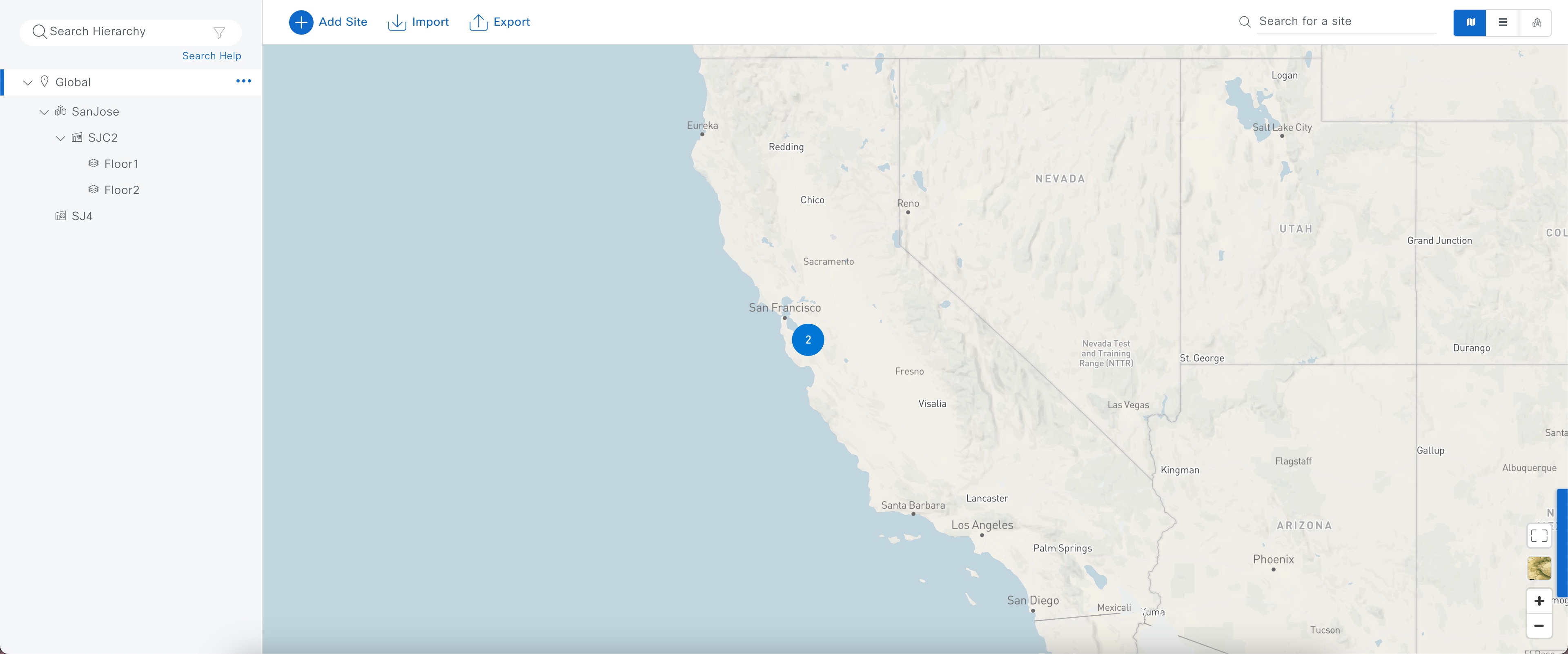 Due to site inheritance, all floors under a particular site inherit the rogue rule profile mapped at the area, site, or building level. For example, as shown in the figure, Floor1 and Floor2 will inherit the rogue rule profile that is mapped at the SanJose level.