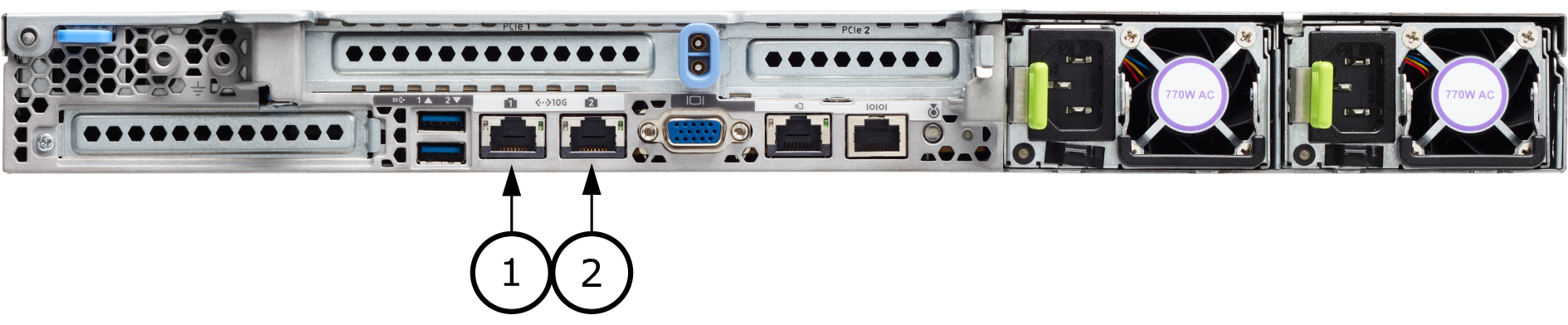Connect the administration network cable to the Administration LAN port (1) to connect the Center with the user interface or the Global Center.