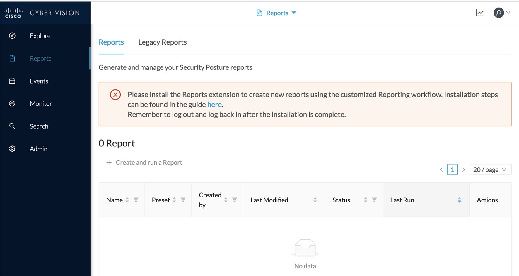You must install the reports extension to be able to use this page. You can do so by importing the reports extension file through the Admin Extension page in Cisco Cyber Vision. The extension file is available on cisco.com.
