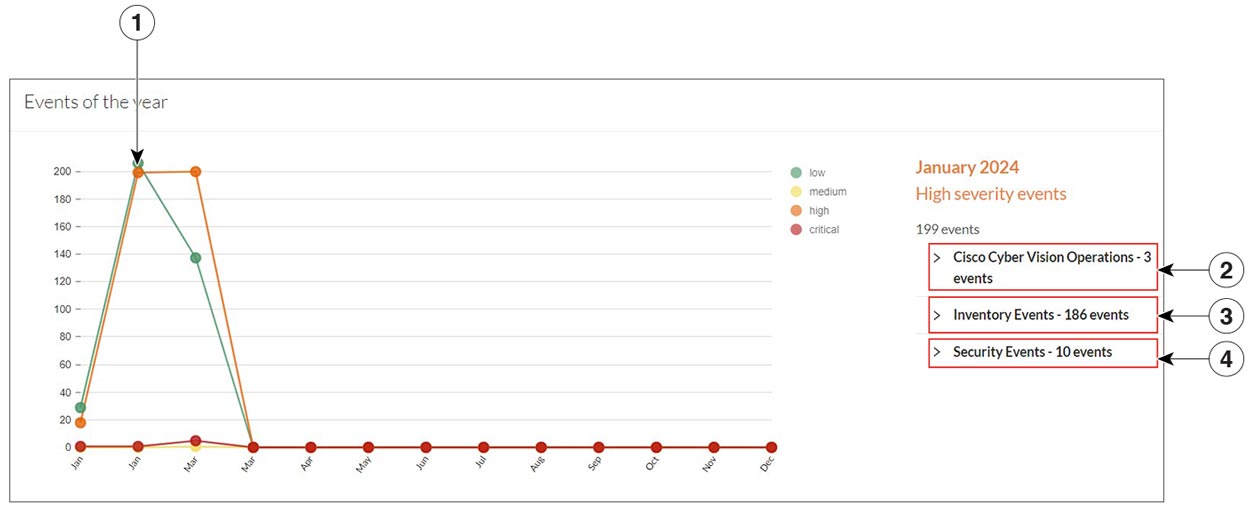 Click event markers (1) on the line to see the number of events per category according to a specific date. Click tab (2) for Cisco Cyber Vision Operations events details, tab (3) for Inventory Events details and tab (4) for Security Events details.