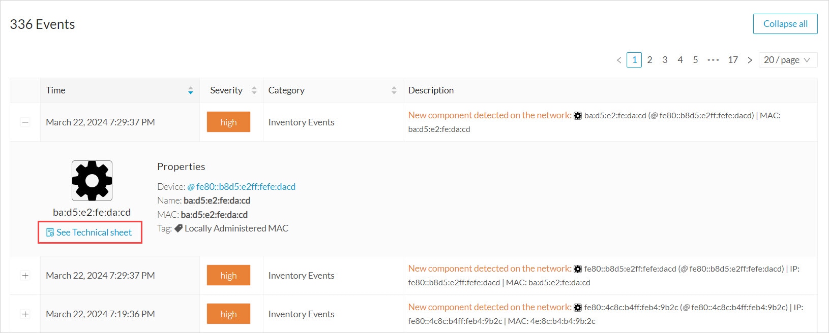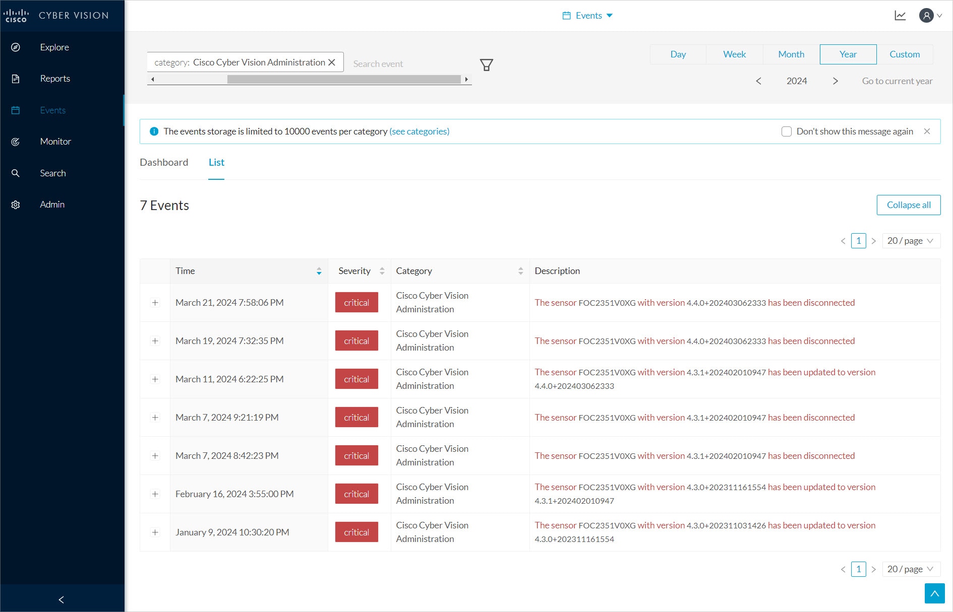 To see the list of Events per categories, click Admin > Events. See the Cisco Cyber Vision Administration Guide.