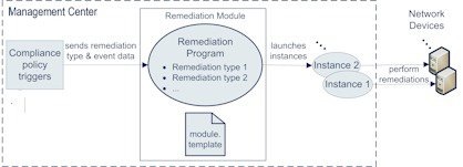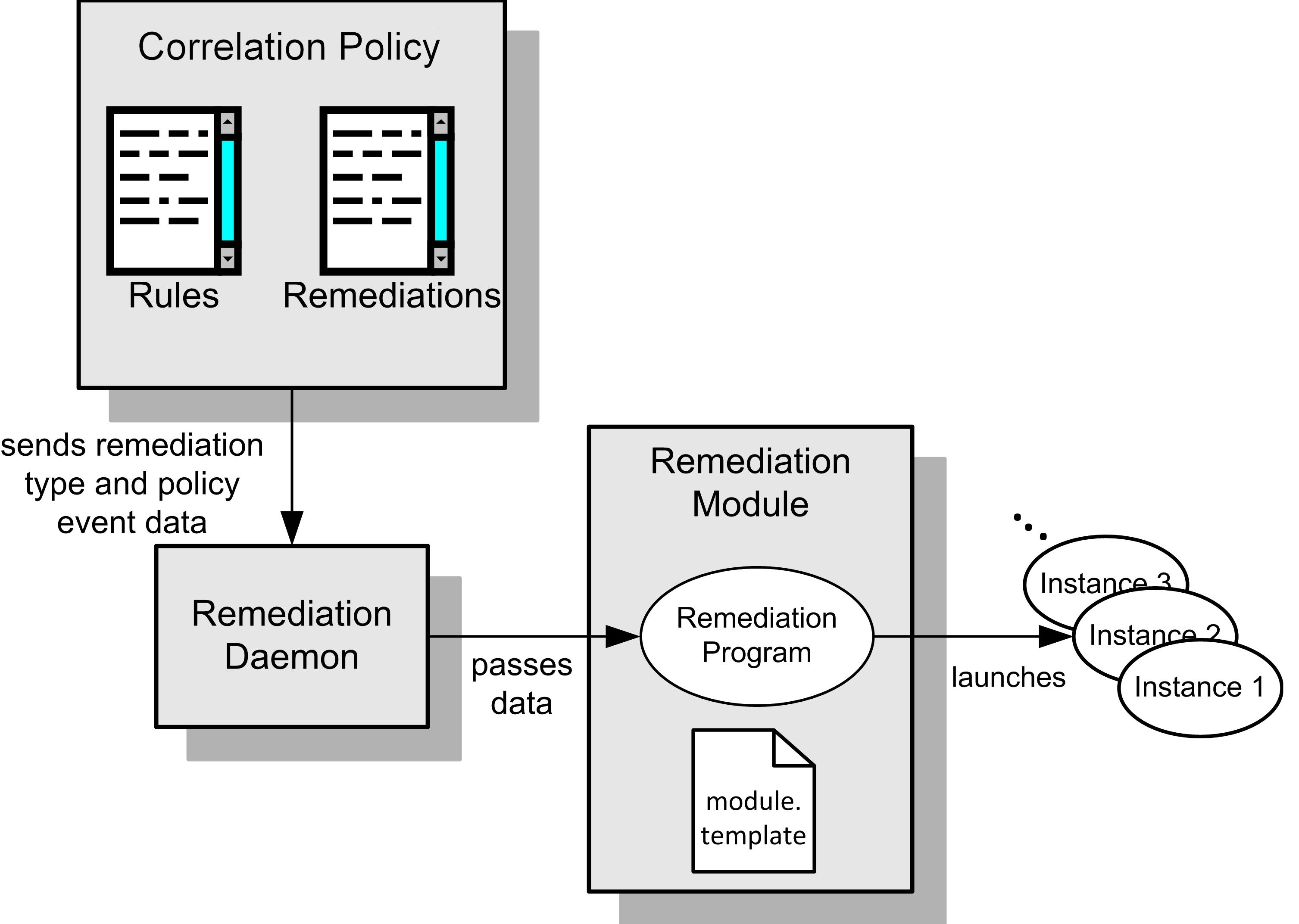 - the individual remediation modules which you develop to respond to specific correlation policy violations. See Remediation Module Architecture for more details.