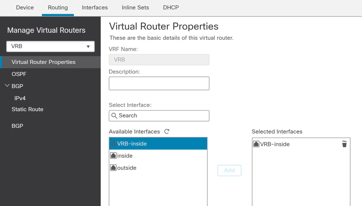 EIGRP, ISIS, and PBR are supported through Flex Config in FMC (see Predefined FlexConfig Objects). Configure only global virtual router interfaces for these features.