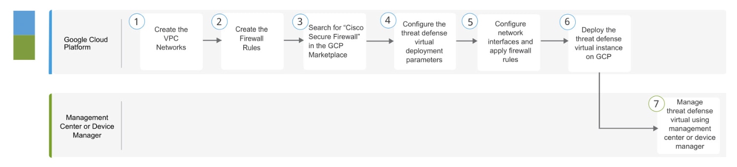 You create an account on GCP, launch a VM instance using the Cisco Firepower NGFW virtual firewall (NGFWv) offering on the GCP Marketplace, and choose a GCP machine type.