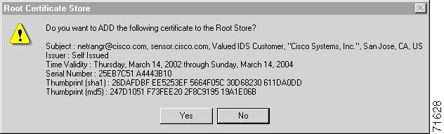 CautionIf you change the organization name or hostname of the sensor, a new certificate is generated the next time the sensor is rebooted. The next time your web browser connects to IDS Device Manager, you will receive the manual override dialog boxes. You must perform the certificate fingerprint validation again for Netscape and Internet Explorer.