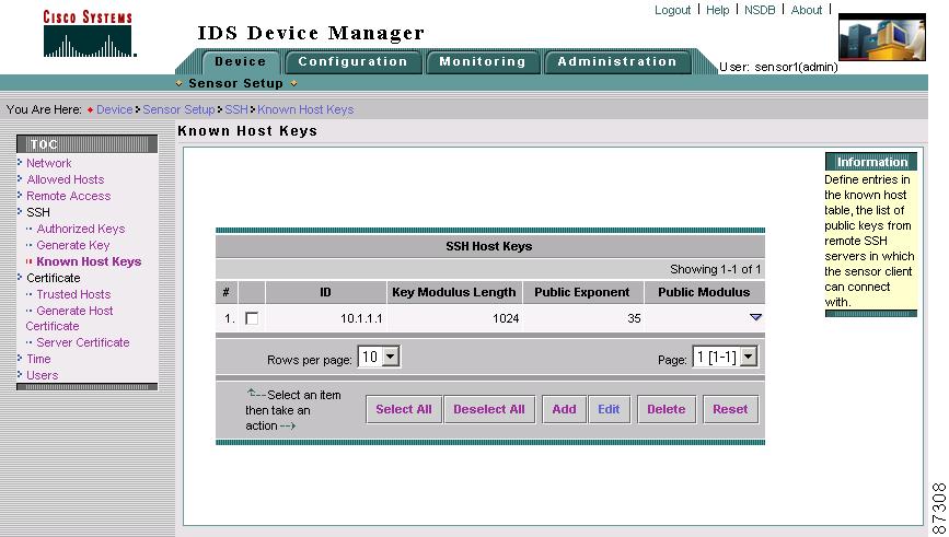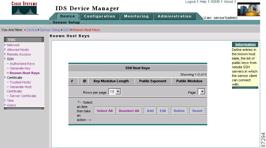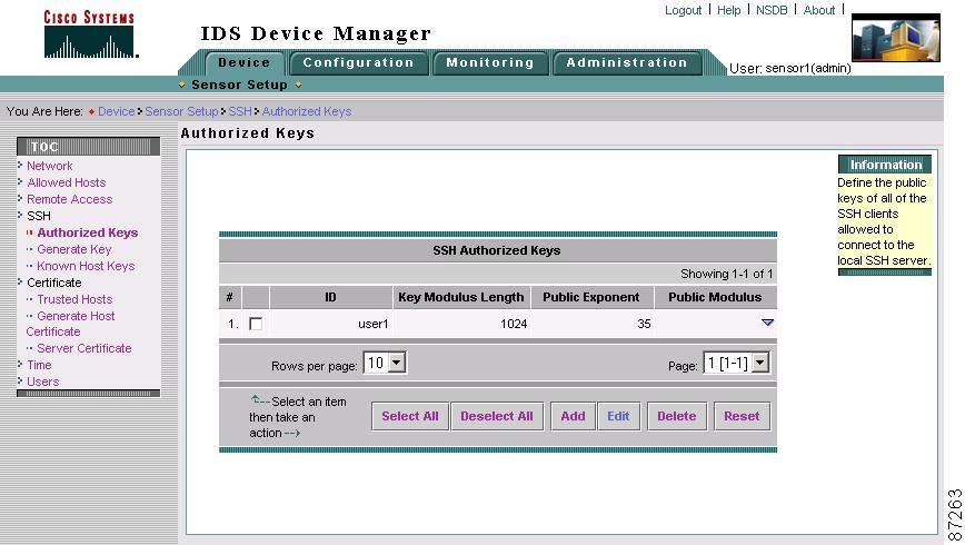 Each user who can log in to the sensor has a list of authorized keys compiled from each client the user logs in with. When using SSH to log in to the sensor, you can use the RSA authentication rather than using passwords.