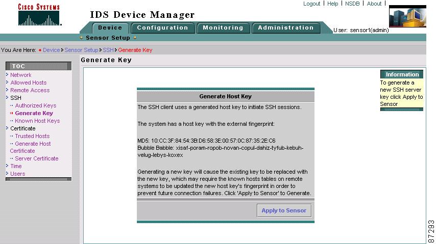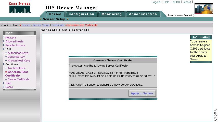 You can generate a new server's self-signed X.509 certificate. A certificate is generated when the sensor is first started. Use the Generate Host Certificate page to generate a new host certificate.