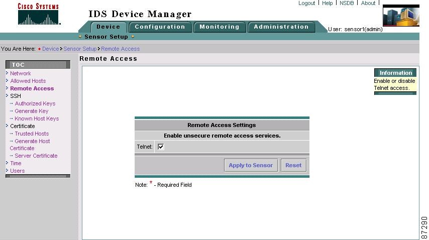 Telnet is not a secure access service and therefore is disabled by default. However, SSH is always running on the sensor and it is a secure service.