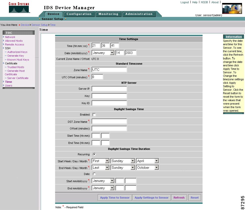 If you define an NTP server, the sensor's time is set by the NTP server. The CLI clock set command will produce an error, but time zone and daylight saving time parameters are valid.