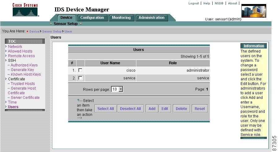 Service—Only one user with service privileges can exist on a sensor. The service user cannot log in to IDS Device Manager. The service user logs in to a bash shell rather than the CLI.