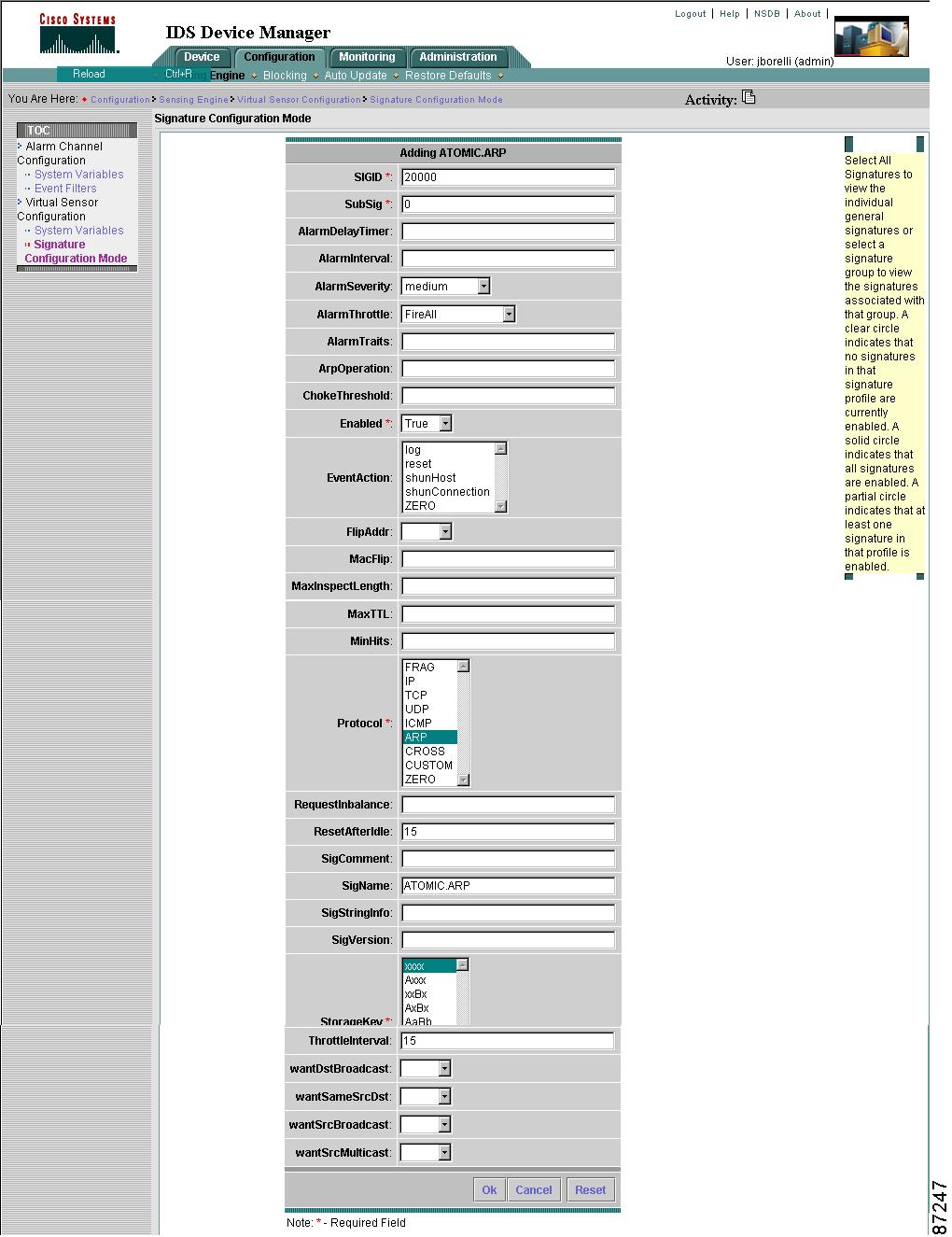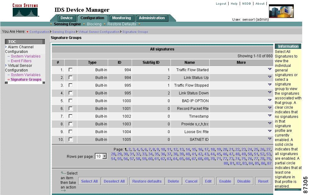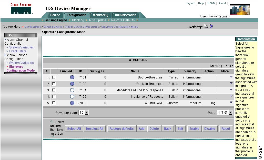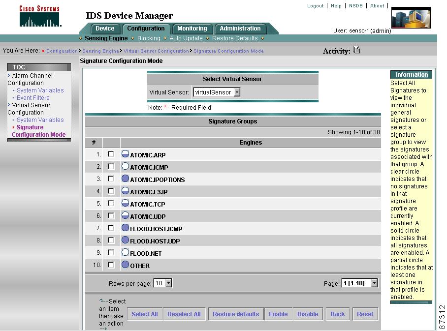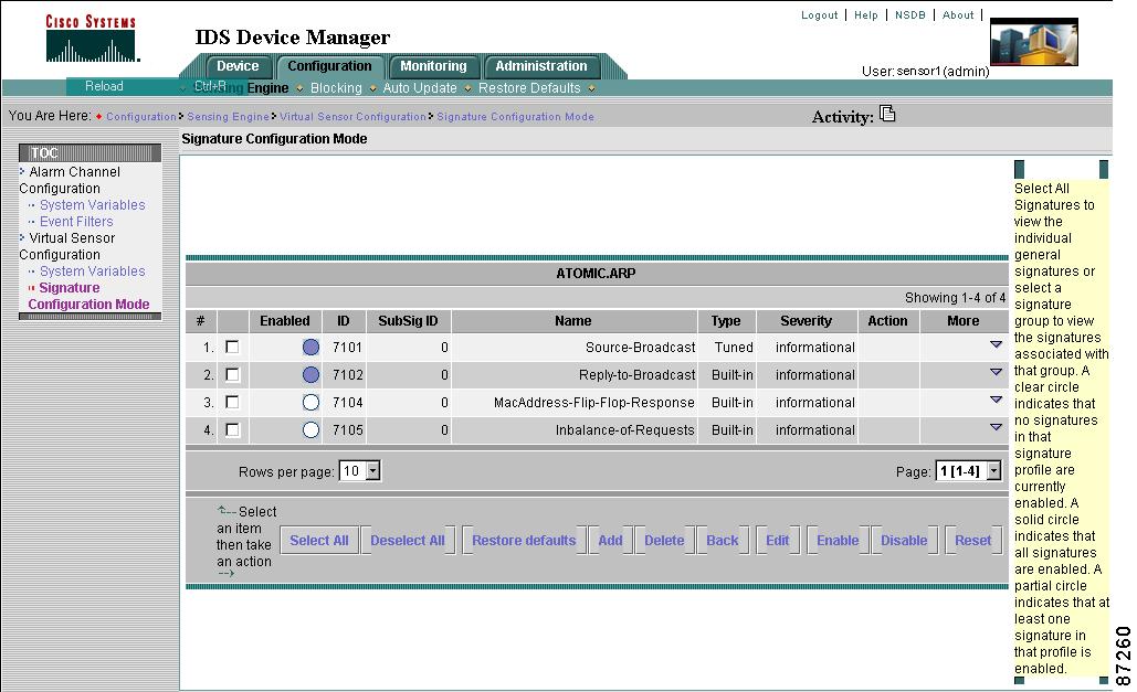 To configure a sensor to monitor network traffic for a particular signature, you must enable the signature. By default, the most critical signatures are enabled when you install IDS Device Manager. When an attack is detected that matches an enabled signature, the sensor generates an alert event (formerly known as an alarm), which is stored in the sensor's event store. The alert events, as well as other events, may be retrieved from the event store by web-based clients. By default the sensor logs all Informational alarms or higher. If you have added IDS Event Viewer as a destination, the alarm is sent to the IDS Event Viewer database and you can view the alarm in IDS Event Viewer.