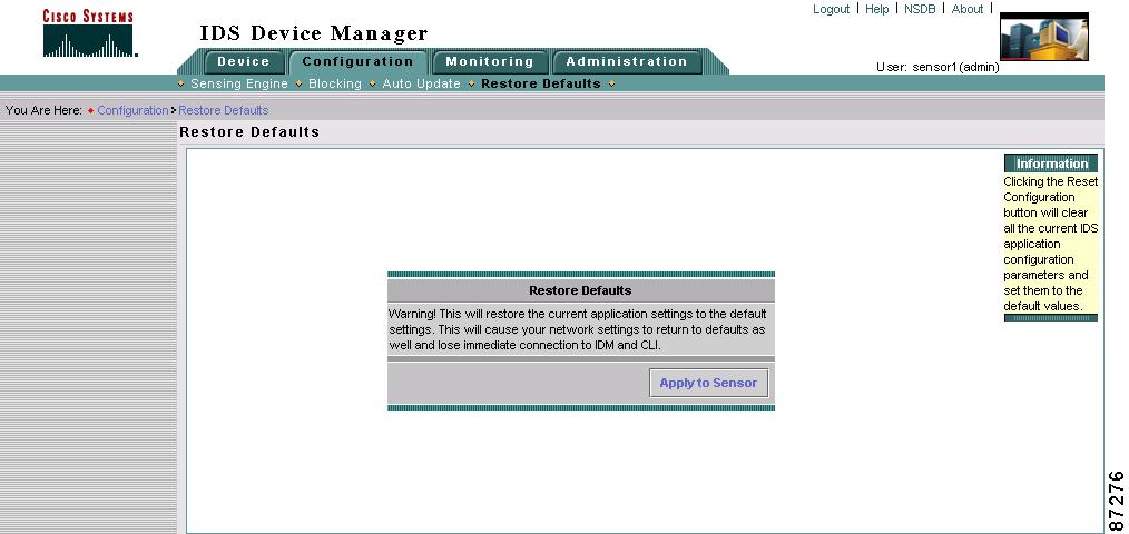 Clicking Apply to Sensor removes the current application settings and restores the default settings. Your network settings also return to the defaults and you immediately lose connection to IDS Device Manager and the CLI.
