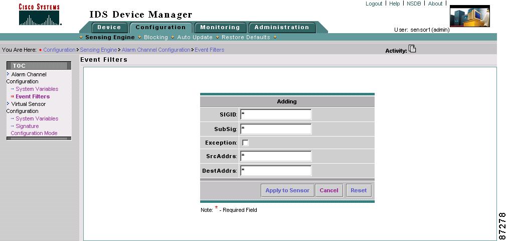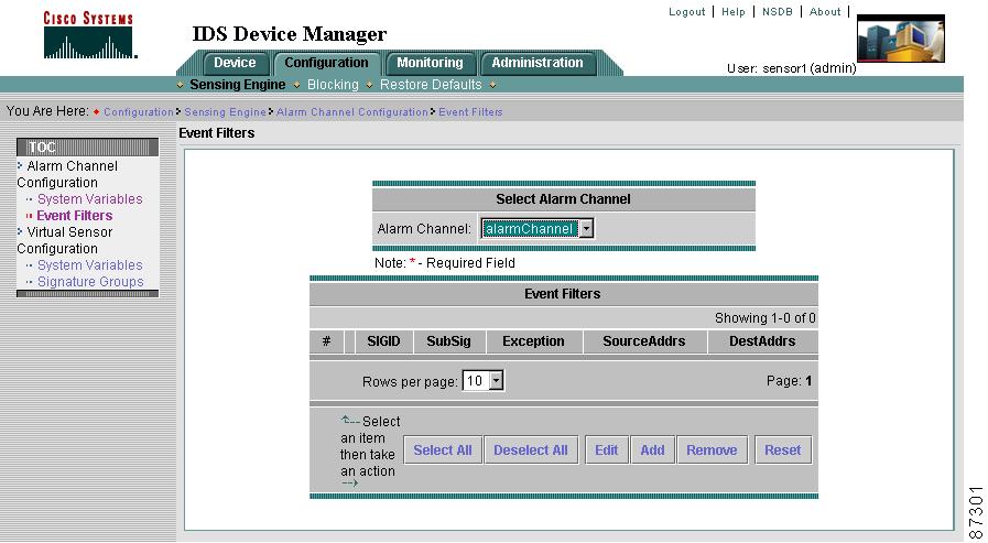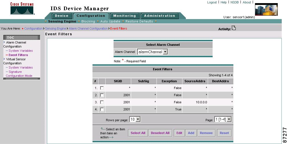 Select Configuration > Sensing Engine > Alarm Channel Configuration > Event Filters.