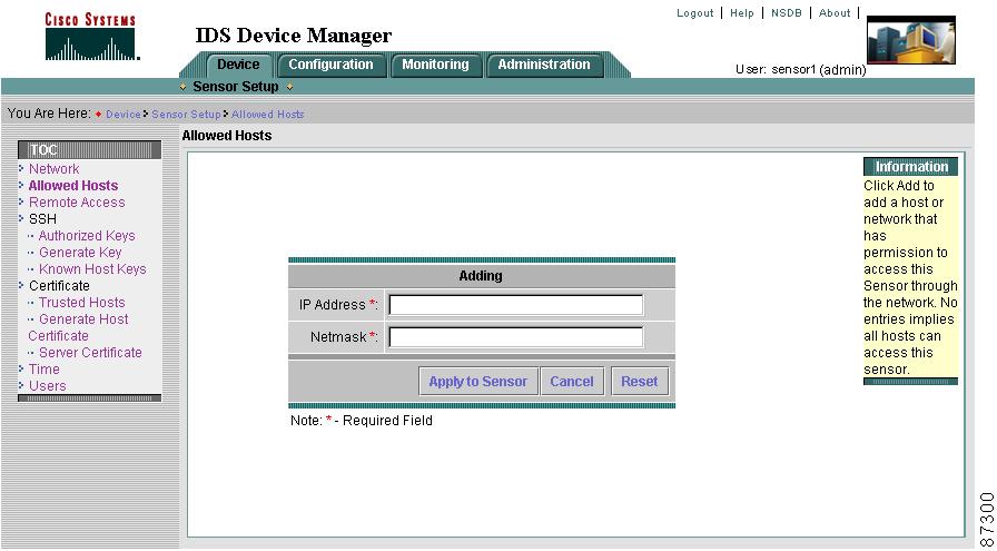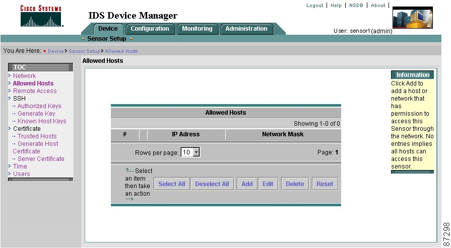Select Device > Sensor Setup > Allowed Hosts.