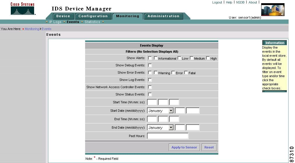 Use the Events page to configure how you want events displayed. You can filter events based on event type, time, or both. By default, all events are displayed.