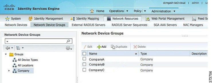 CompanyA、CompanyB、CompanyC のようなネットワーク デバイス グループ(NDG)タイプを定義し、各社のネットワーク デバイスを追加します。