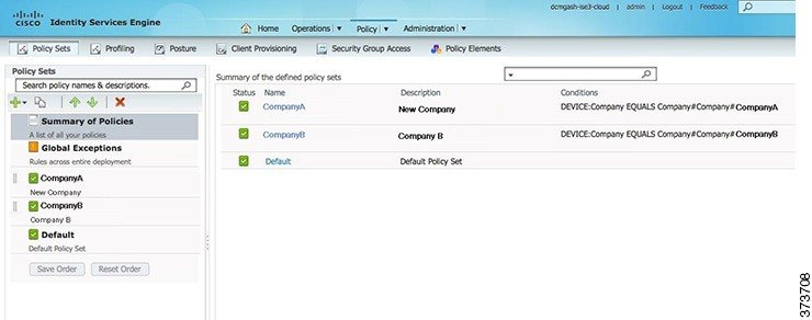 ポリシー セットを設定し、会社の認証のために、会社の NDG を Active Directory のスコープに結び付けます。各会社では独自のポリシーも必要となるため、会社独自のポリシー グループで認可ポリシーを定義できます。