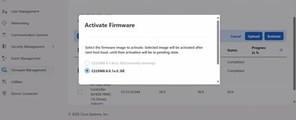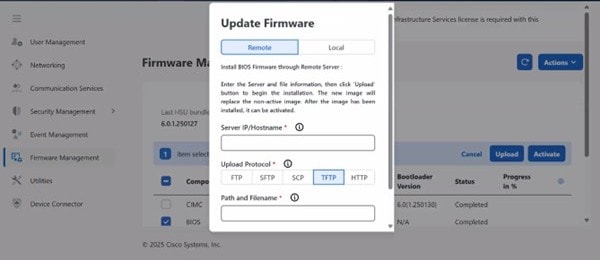 You must perform these steps in the same sequence to upgrade and activate the firmware. If the BIOS firmware is not upgraded before the HUU ISO upgrade, then the BIOS will not be loaded properly and the boot options will not be displayed. |