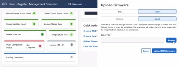Check the BIOS check box and click Upload. ![]() You can also use the Upload Firmware option in the Quick Actions section. ![]() |