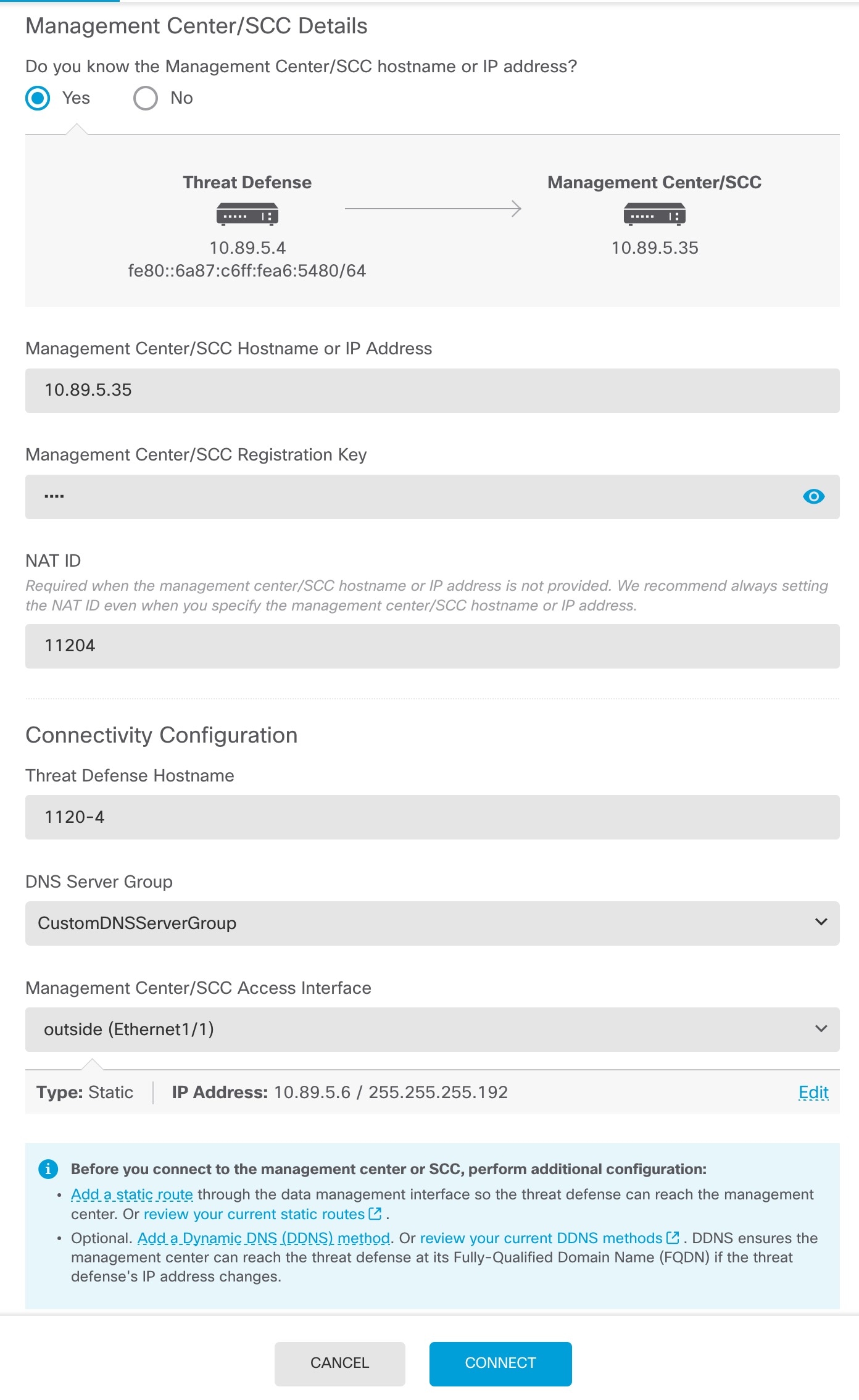 | 9. | After the Saving Management Center/SCC Registration Settings step on the status screen, go to the Firewall Management CenterSecurity Cloud Control and add the firewall. See Add a firewall using manual provisioning. |