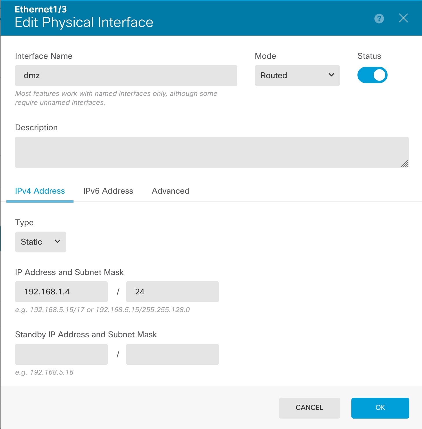 | 2. | If you wired other interfaces, choose Device, and then click the link in the Interfaces summary. Click the edit icon ( The following example configures an interface to be used as a “demilitarized zone” (DMZ), where you place publicly-accessible assets such as your web server.