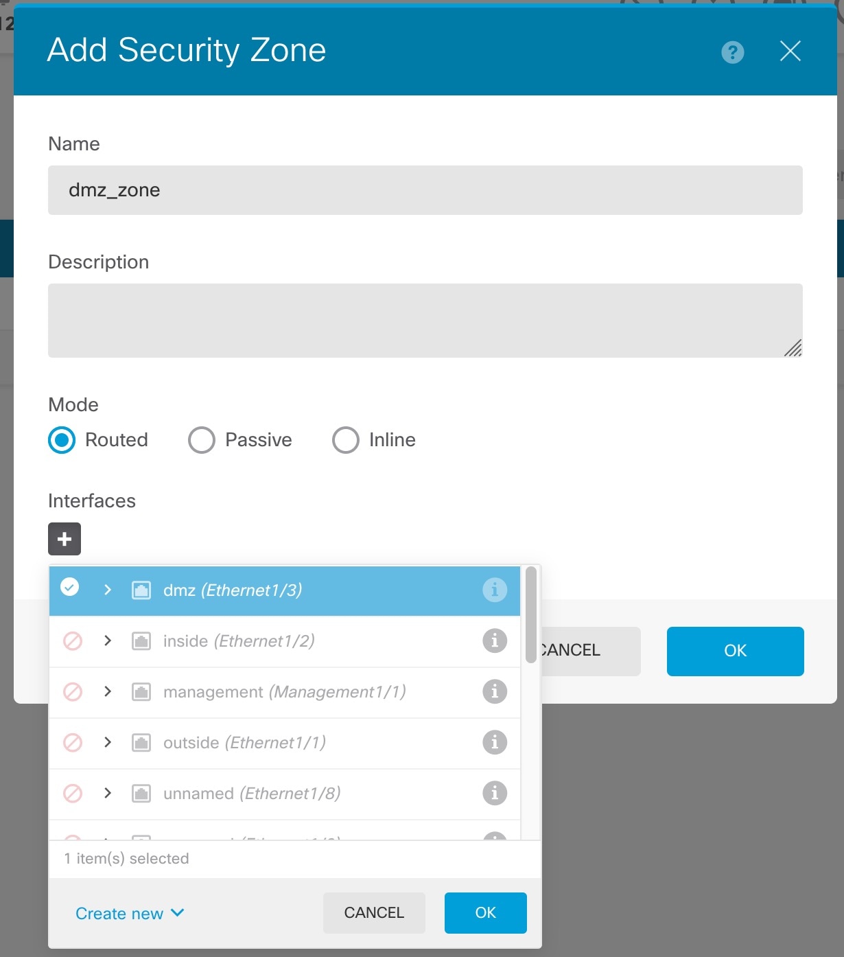 | 3. | If you configured new firewall interfaces, choose Objects, then select Security Zones. Edit or create new zones as appropriate and assign the interface to the zone. Each interface must belong to a zone for which you configure policies. The following example creates a new dmz_zone and then assigns the dmz interface to it.