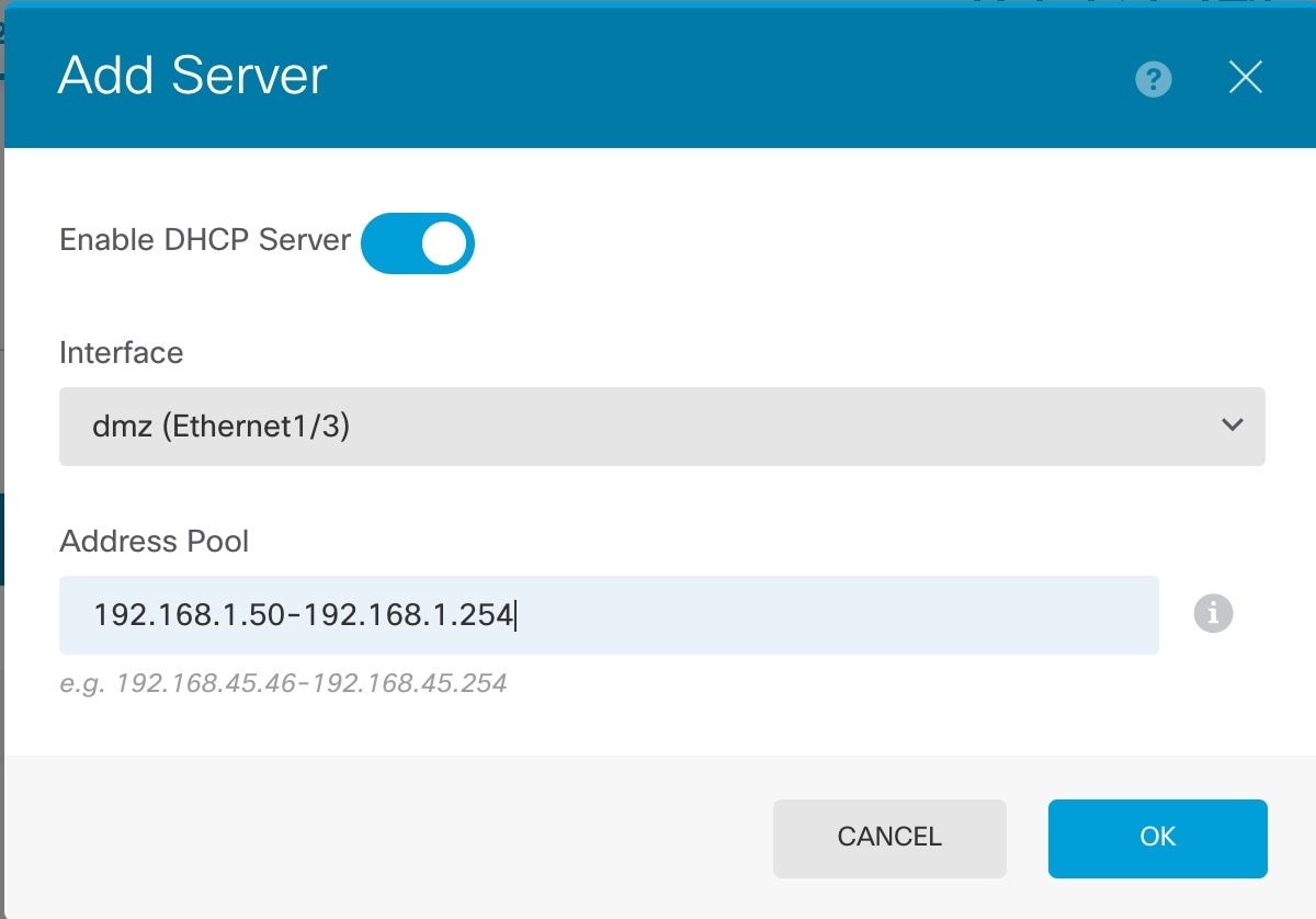 | 4. | If you want internal clients to use DHCP to obtain an IP address from the device, choose , then select the DHCP Servers tab. There is already a DHCP server configured for the inside interface.