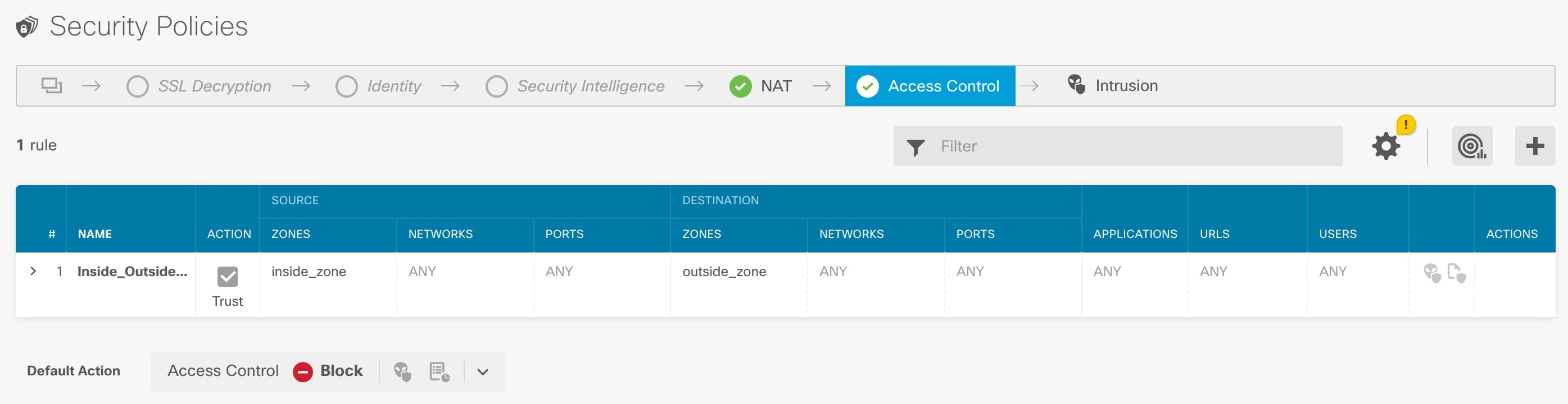 | 5. | Choose Policies and configure the security policies for the network. The device setup wizard enables traffic flow between the inside_zone and outside_zone using a Trust rule. A Trust rule does not apply an intrusion policy. To use intrusion, specify the Allow action for the rule. The policy also includes interface PAT for all interfaces when going to the outside interface.