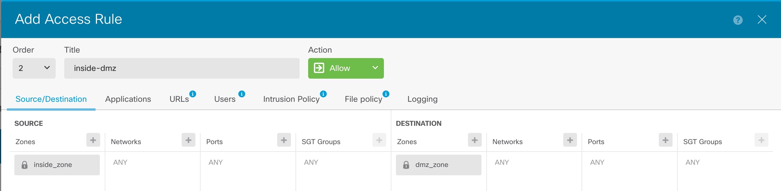 The following example shows how to allow traffic between the inside_zone and dmz_zone in the access control policy. In this example, no options are set on any of the other tabs except for Logging, where At End of Connection is selected.