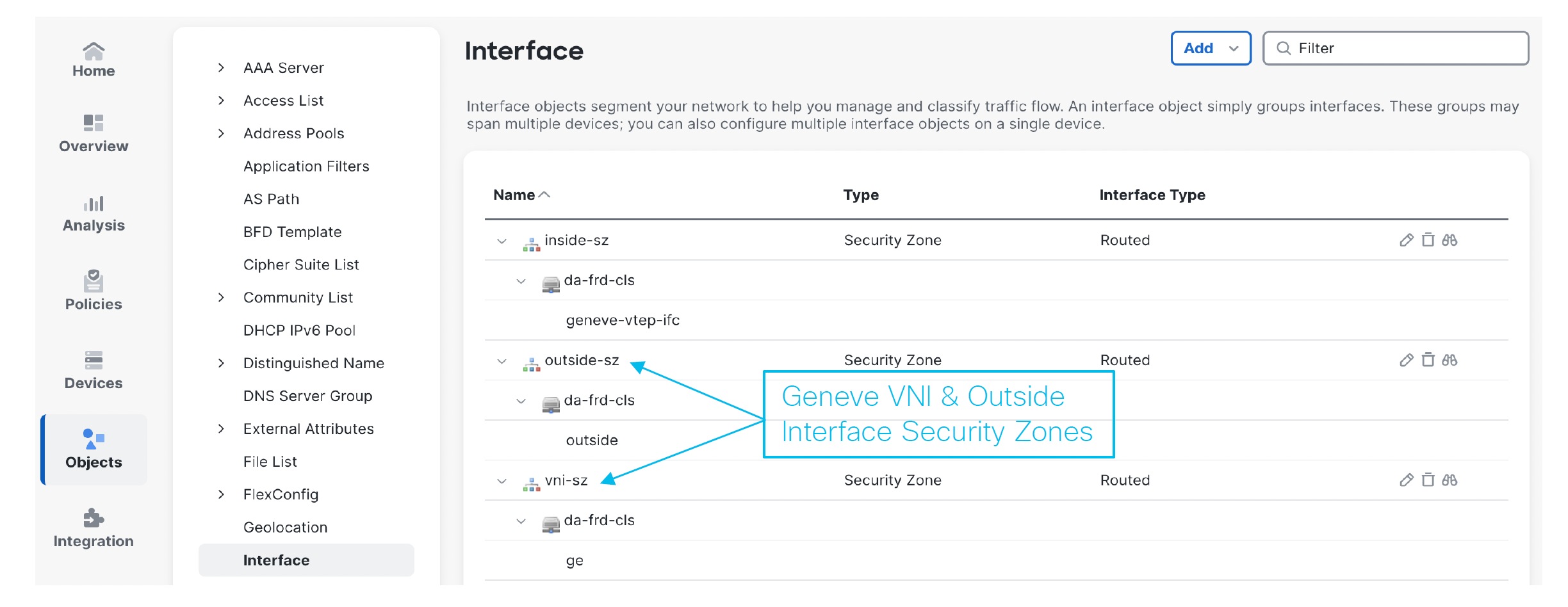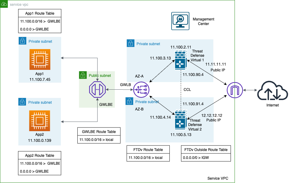 The AWS Gateway Load Balancer combines a transparent network gateway and a load balancer that distributes traffic and scales virtual appliances on demand. The Firewall Threat Defense Virtual supports the Gateway Load Balancer centralized control plane with a distributed data plane (Gateway Load Balancer endpoint) using a Geneve interface single-arm proxy.