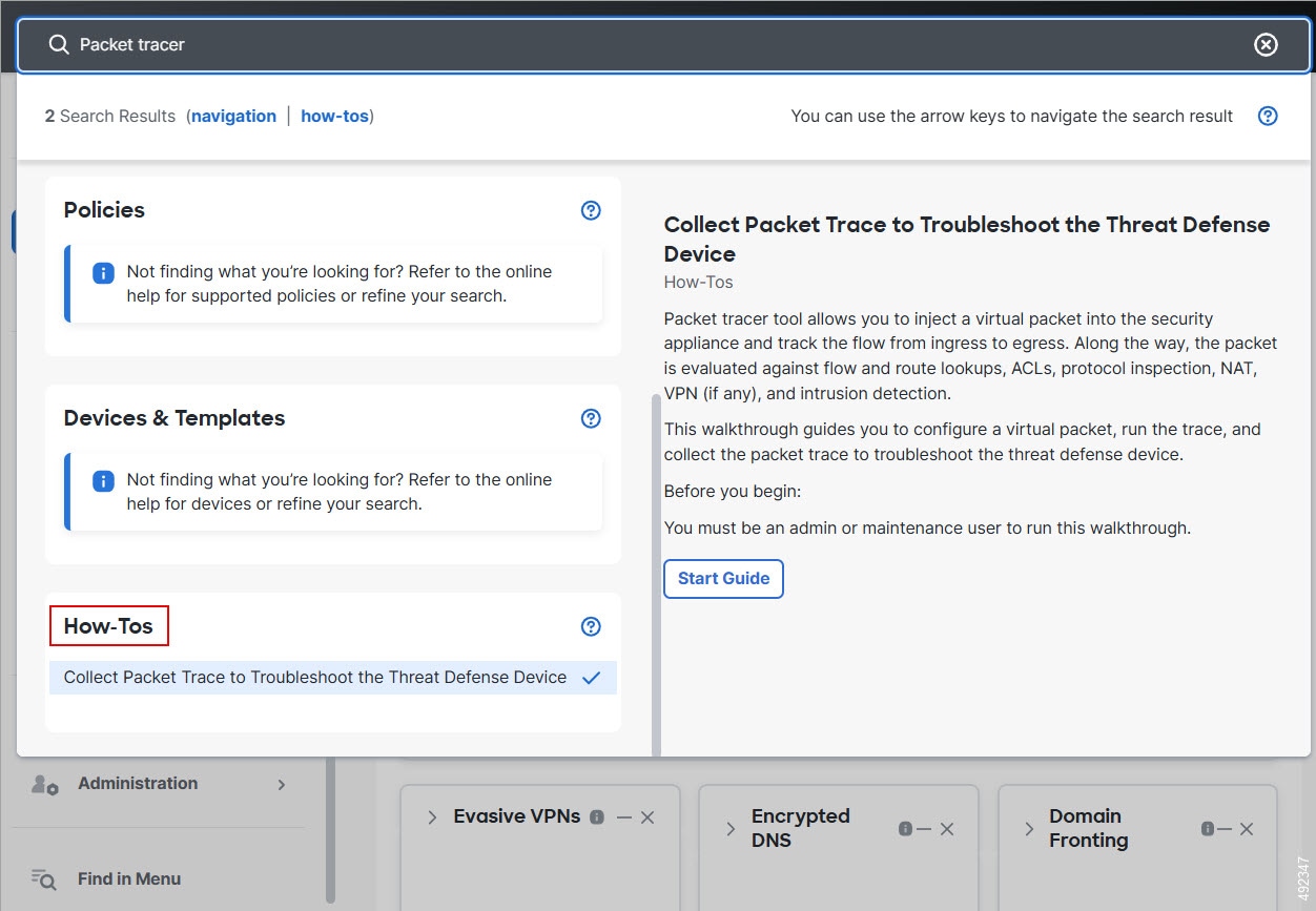 You can also use the global search feature of the Firewall Management Center to quickly find walkthroughs of your interest. Search for the walkthrough title or terms in the walkthrough title for better search results.