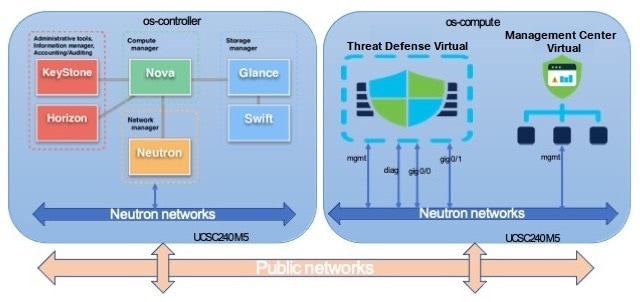 A sample network topology for Firewall Management Center Virtual on OpenStack, showing management and compute nodes deployed on UCS C240 M5 servers and connected to Neutron and public networks for optimized integration.