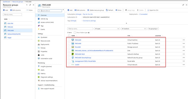 After the Firewall Management Center Virtual VM is created, the Microsoft Azure Dashboard lists the new Firewall Management Center Virtual VM under Resource groups. The corresponding storage account and network resources also are created and listed. The Dashboard provides a unified view of your Azure assets, and provides an easy, at-a-glance assessment of the health and performance of the Firewall Management Center Virtual.