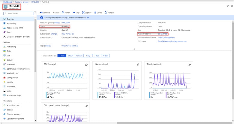 Observe that the status is Running. You can stop, start, restart, and delete the Firewall Management Center Virtual VM from the Virtual machine page in the Microsoft Azure portal. Note that these controls are not graceful shutdown mechanisms for the Firewall Management Center Virtual; see Guidelines and Limitations for graceful shutdown information. |