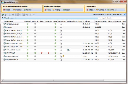 You can use the Device Status View to quickly see the status of the devices in the Security Manager inventory. The Device Status View window aggregates information from several applications and tools within Cisco Security Manager. You can use the Device Status View to quickly see the status of all your devices or specific groups of devices and can easily navigate to the areas in Security Manager you need to act on that information.