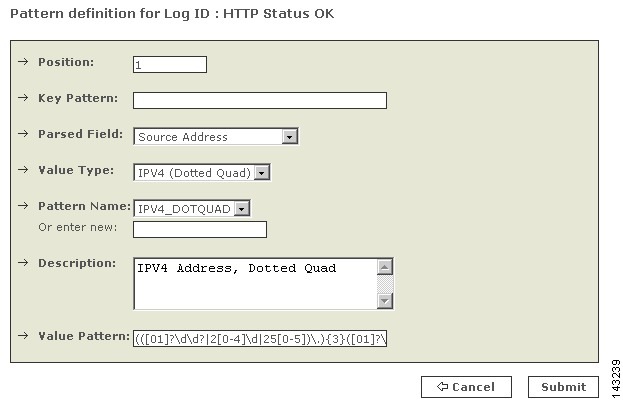 The above KEY-VALUE sub-pattern in the 2nd position of the log format. Notice that the key pattern isn't just a simple string, it is a regexp \d+ which matches against all unsigned decimal numbers. The parsed field where the above value is stored is the Source Address which is specified as a dotted quad. Notice the somewhat complicated regexp that only capture IP addresses in the correct range (0.0.0.0 through 255.255.255.255).