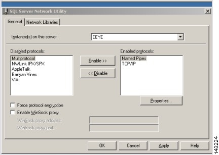 In the SQL Server Network Utility dialog box, enable TCP/IP by moving TCP/IP from the Disabled Protocols list to Enabled Protocols list.