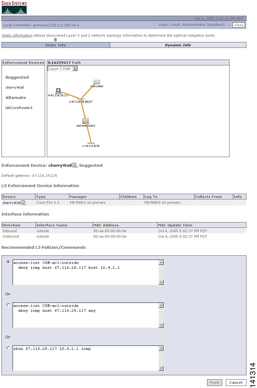 The Mitigation pop-up window appears, with any possible Static topology and mitigation information, as shown in Figure 20-9.CS-MARS recommends enforcement devices and mitigation commands. For static information, if the network is entirely discovered and CS-MARS has command level access to a Layer 2 enforcing device, the Push button appears red, otherwise it is gray. In Figure 20-9, CS-MARS does not have sufficient static information to identify a Layer 2 enforcement device, but can suggest mitigation commands for discovered Layer 3 devices (Cisco PIX firewall, and a Cisco router). Layer 3 mitigation commands must be configured manually on the Layer 3 devices.