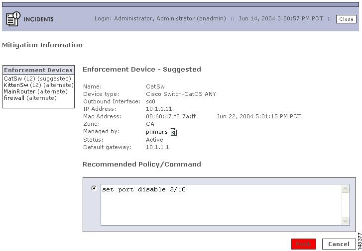 Once you identify the compromised host (in this example, 10.1.252.250 connected to CatSw), it is critical to prevent it from attacking other hosts in the same subnet or other parts of the network. The MARS provides one-click mitigation that lets you isolate the compromised host from the rest of the network.