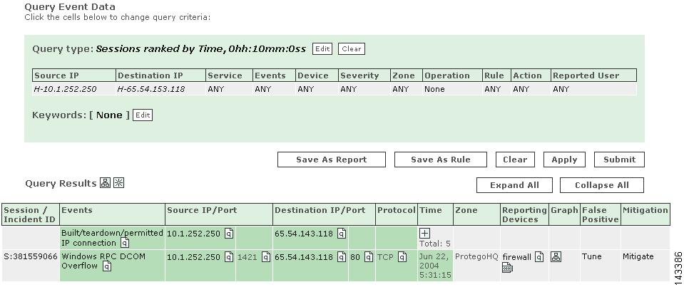 Click QUERY / REPORTS and submit a query using the appropriate query criteria. Note that in our example, we limit the scope of the query so it runs faster. In the following Query Event Data screen we use the result format All Matching Sessions and query events from Source IP 10.1.252.250 and Destination IP 65.54.153.118 over the last 10 minutes.