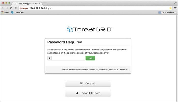 In a browser, enter the URL for the OpAdmin portal (https://<adminIP>/ or https://<adminHostname>/) to open the Threat Grid OpAdmin login screen.