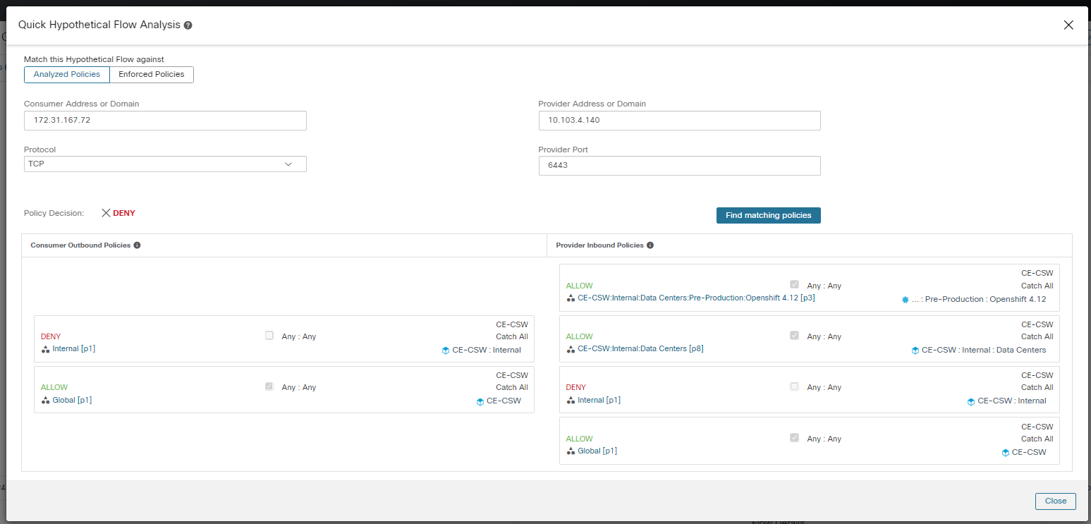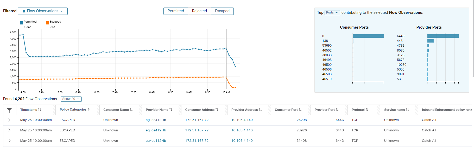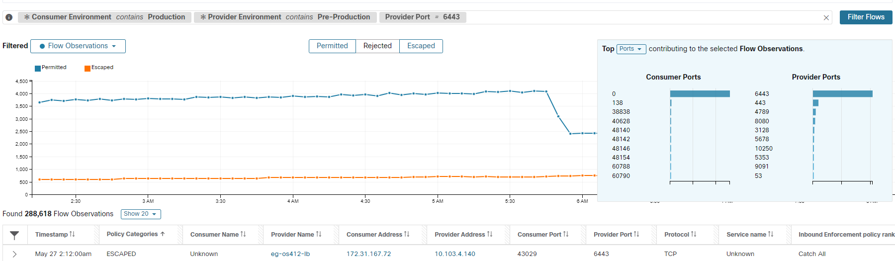 According to policy analysis, an Escaped flow in a network is a flow that should be dropped and not allowed further. Escaped flows require special attention because their actual flow disposition differs from the planned action based on the currently analyzed policies. Investigate to ensure that enforcing these policies does not block the required flows and adversely impact your applications.