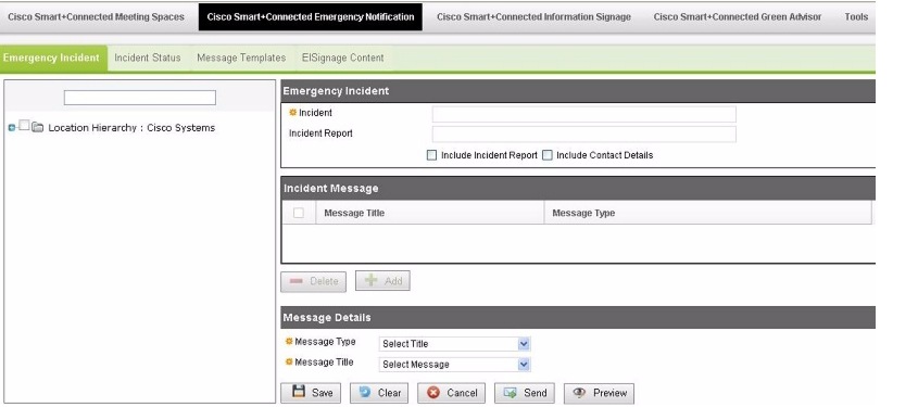 Managing the emergency incident messages—You can add the emergency incident messages and save these in the Smart+Connected DS application by using the defined templates, audio recordings, or images. You can also associate these messages with specific locations where the message needs to be broadcast. In addition, you can enable or disable the saved messages. This helps you in quickly broadcasting these messages to digital signage/IEC and Cisco IP phones during an emergency.