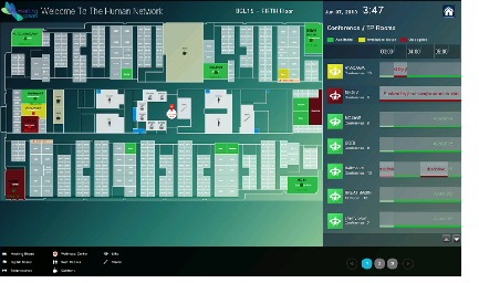 The schedule details of the primary conference rooms are displayed prominently on the digital signage/IEC.