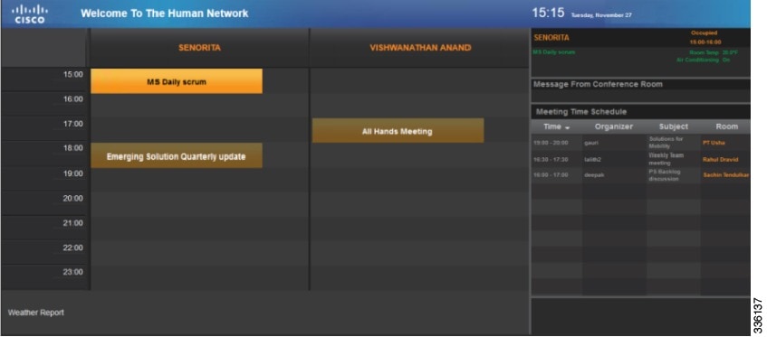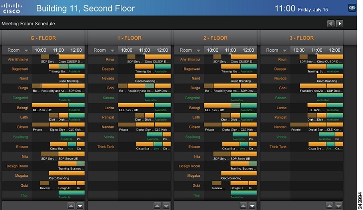 Note The reserved conference rooms are displayed in orange, and the available conference rooms are displayed in green on the digital signage/IEC. The