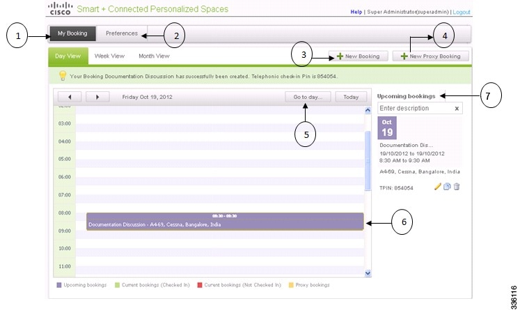 You are redirected to the home page and the booking appears in the calendar view. The booking details are also shown in the Upcoming Bookings pane along with a telephonic check-in PIN number. This TPIN number is also sent to you through email. You are required to log in to the Smart+Connected Spaces application through the Cisco IP Phone only.