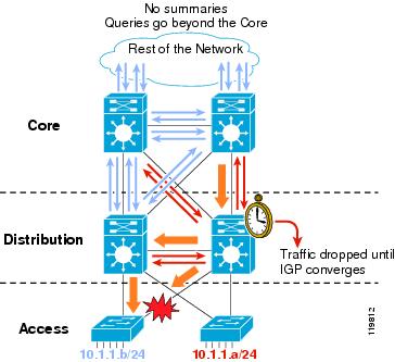 The end result is that for return path traffic, the distribution node that is coming back online can not resolve all the IP to MAC addresses for the L2 domain that it supports for a considerable period of time. In a 40-node access layer test, recovery times of up to four seconds were measured for all flows to be re-established during this convergence event. Results vary depending on the size of the L2 domain supported by the distribution pair.