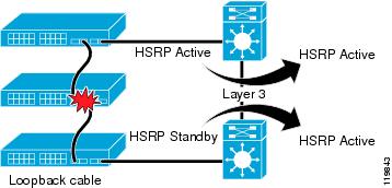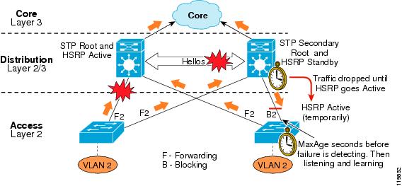 When an indirect failure is detected and STP/RSTP converges, the distribution nodes reestablish their HSRP relationships and the primary HSRP peer preempts. This causes yet another convergence event when Access-a end points start forwarding traffic to the primary HSRP peer. The unexpected side effect is that Access-a traffic goes through Access-b to reach its default gateway. The Access-b uplink to the backup HSRP peer to Access-b is now a transit link for Access-a traffic, and the Access-b uplink to the primary HSRP peer must now carry traffic for both Access-b (its original intent) and for Access-a.