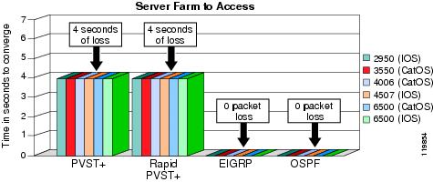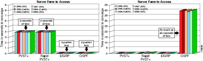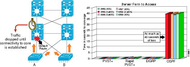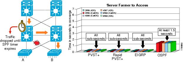 Return path traffic is dropped until the SPF timer has expired and normal reroute processing is completed. While PVST+, Rapid PVST+, and EIGRP all converged in less than one second (EIGRP in sub 200 ms), OSPF required at least 1.65 seconds to converge around this specific failure.