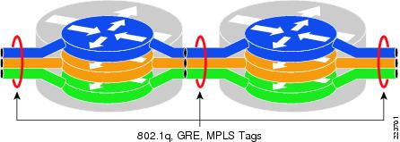 Just as with a VLAN based network using 802.1q trunks to extend the VLAN between switches, a VRF based design uses 802.1q trunks, GRE tunnels, or MPLS tags to extend and tie the VRFs together. See Figure 28.